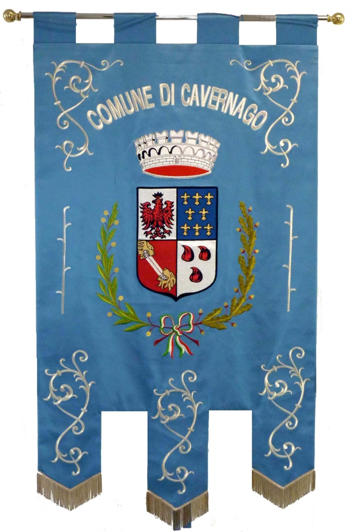 Drappo di colore azzurro riccamente ornato di ricami d'argento e caricato dello stemma sopradescritto con l'iscrizione centrate in argento "Comune di Cavernago". Le parti di metallo ed i cordoni saranno argentati. L'asta verticale sarà ricoperta di velluto azzurro con bullette argentate poste a spirale. Nella freccia sarà rappresentato lo stemma del Comune e sul gambo inciso il nome. Cravatta e nastri colorati tricolorati dai colori nazionali frangianti di argento.