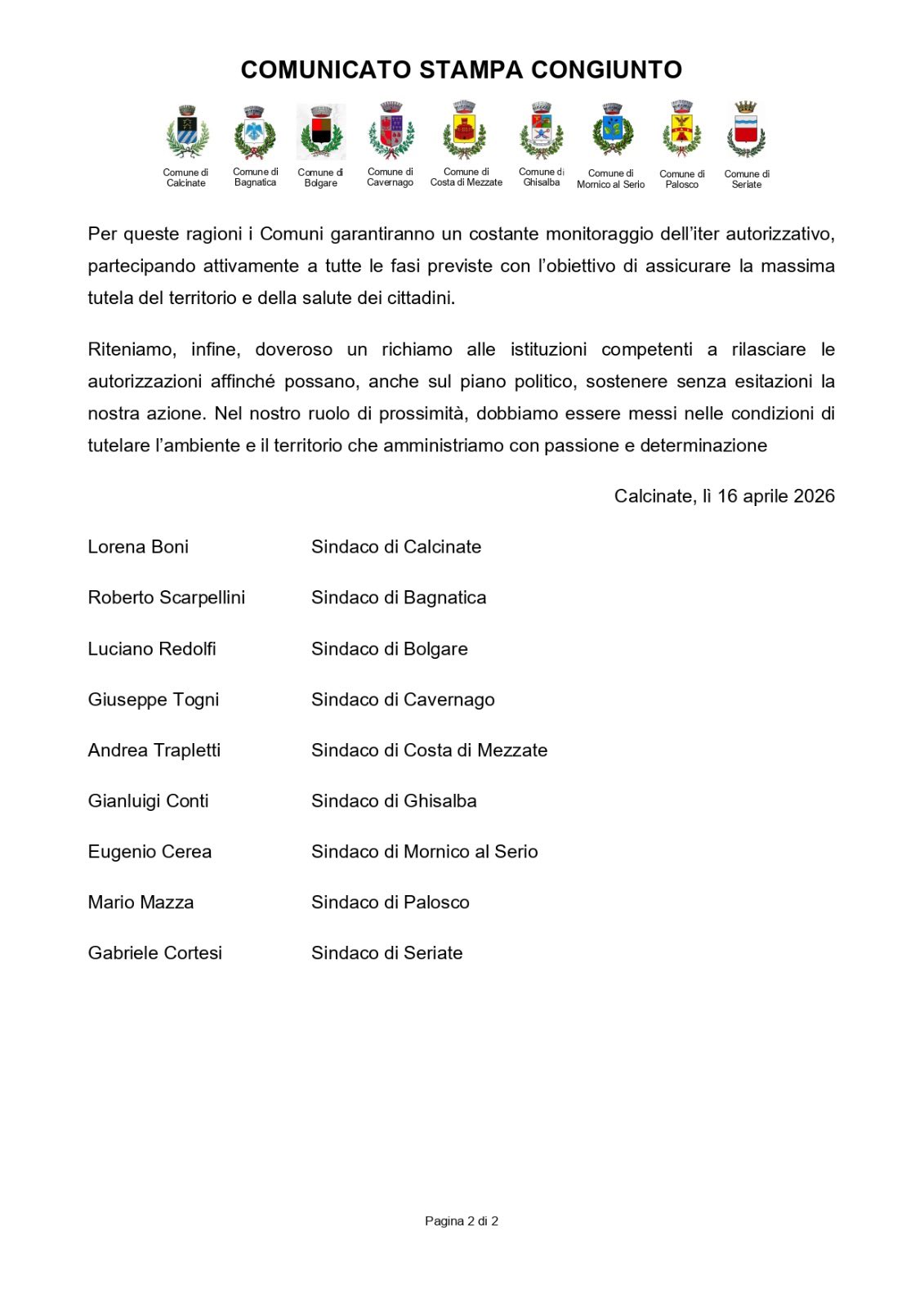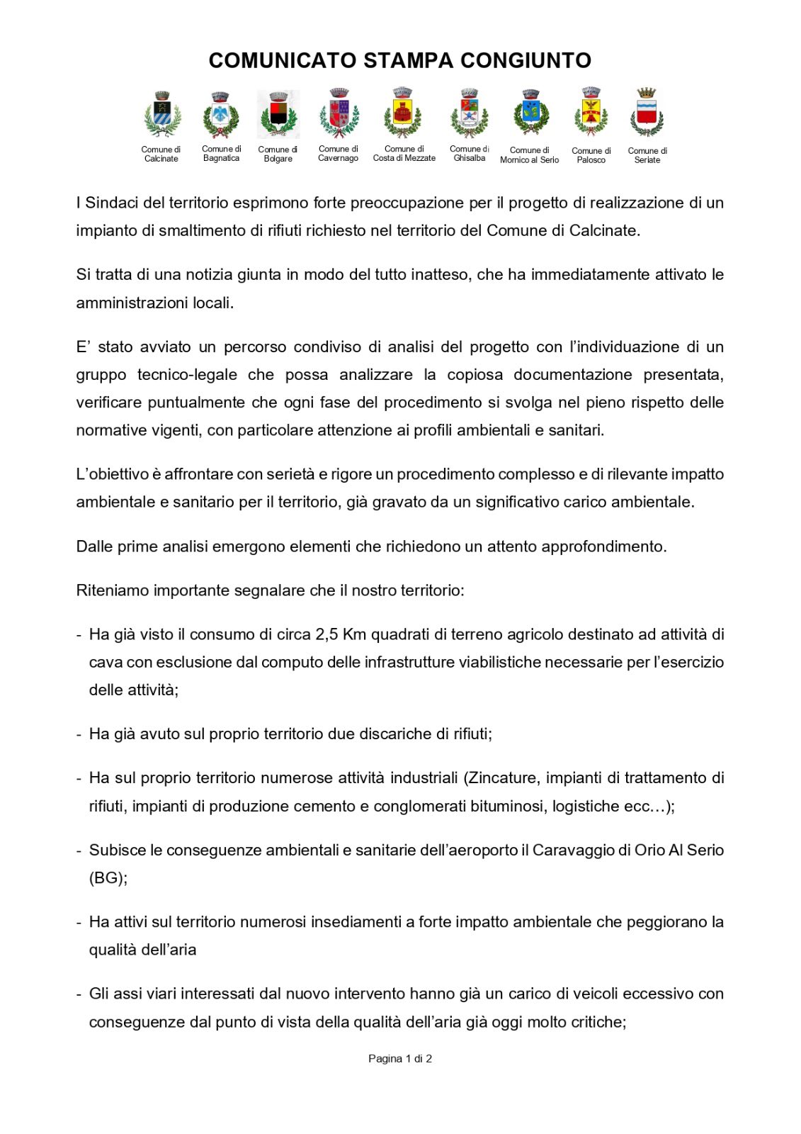 Si allega comunicato stampa relativo all'impianto di smaltimento rifiuti che si vorrà realizzare su territorio di Calcinate.