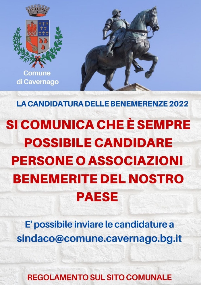 Si comunica che è sempre possibile segnalare persone per la Benemerenza BARTOLOMEO COLLEONI. Per leggere il regolamento: https://www.comune.cavernago.bg.it/.galleries/documenti/risorse/Regolamenti/Regolamento-Benemernze-civiche-Bartolomeo-Colleoni-revisione-1.pdf