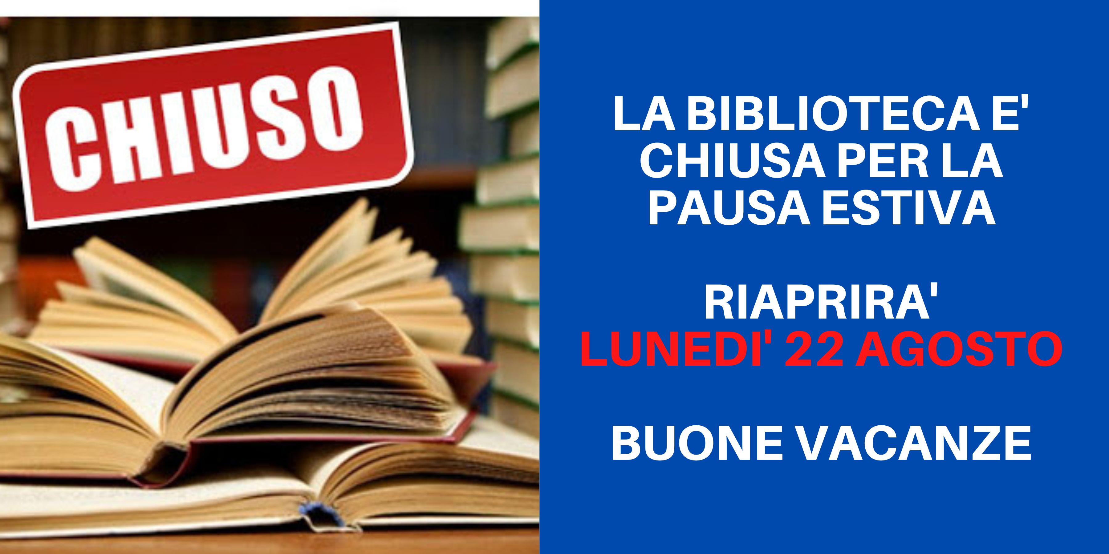 Si comunica che la biblioteca comunale è chiusa per la pausa estiva. Riaprirà LUNEDI' 22 AGOSTO 2022. Buone vacanze.