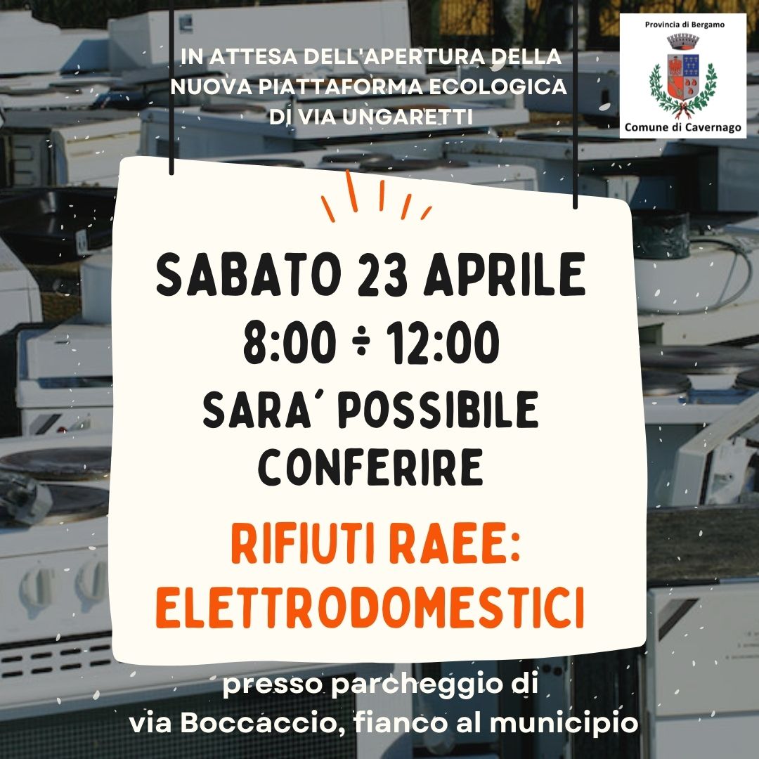 Sabato 23 aprile 2022 ore 8:00 ÷ 12:00 sarà possibile conferire rifiuti RAEE presso il parcheggio di via Boccaccio a fianco al municipio-