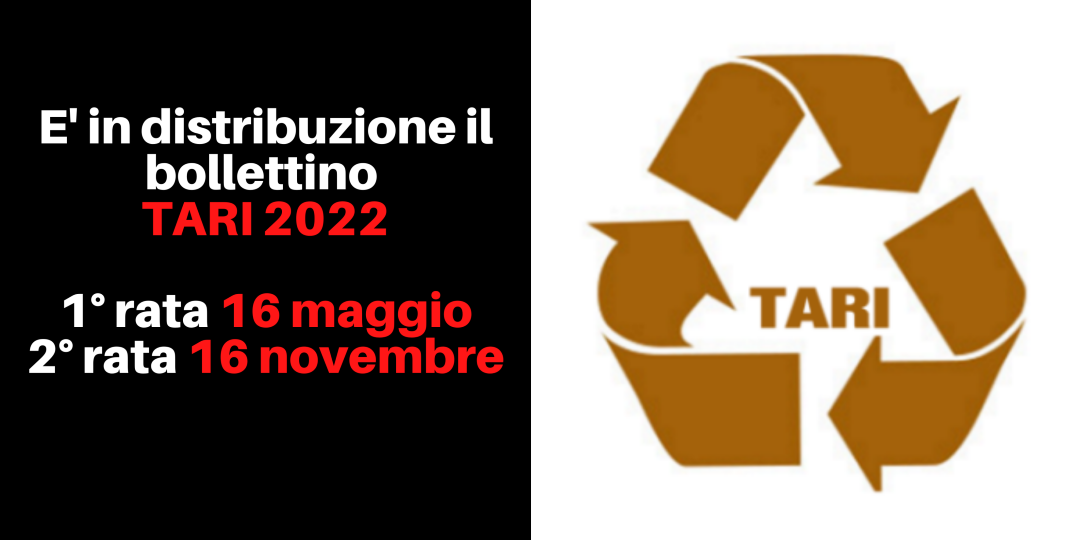 E' in distribuzione casa per casa il bolletino TARI 2022 (tassa rifiuti). Scadenze: 1° rata 16 maggio 2022 2° rata 16 novembre 2022