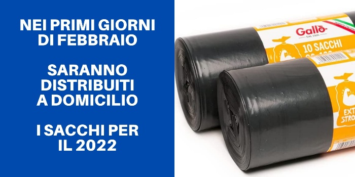 Si comunica che i primi giorni di febbraio saranno distribuiti a domicilio i sacchi dell'iimmondizia per l'anno 2022.