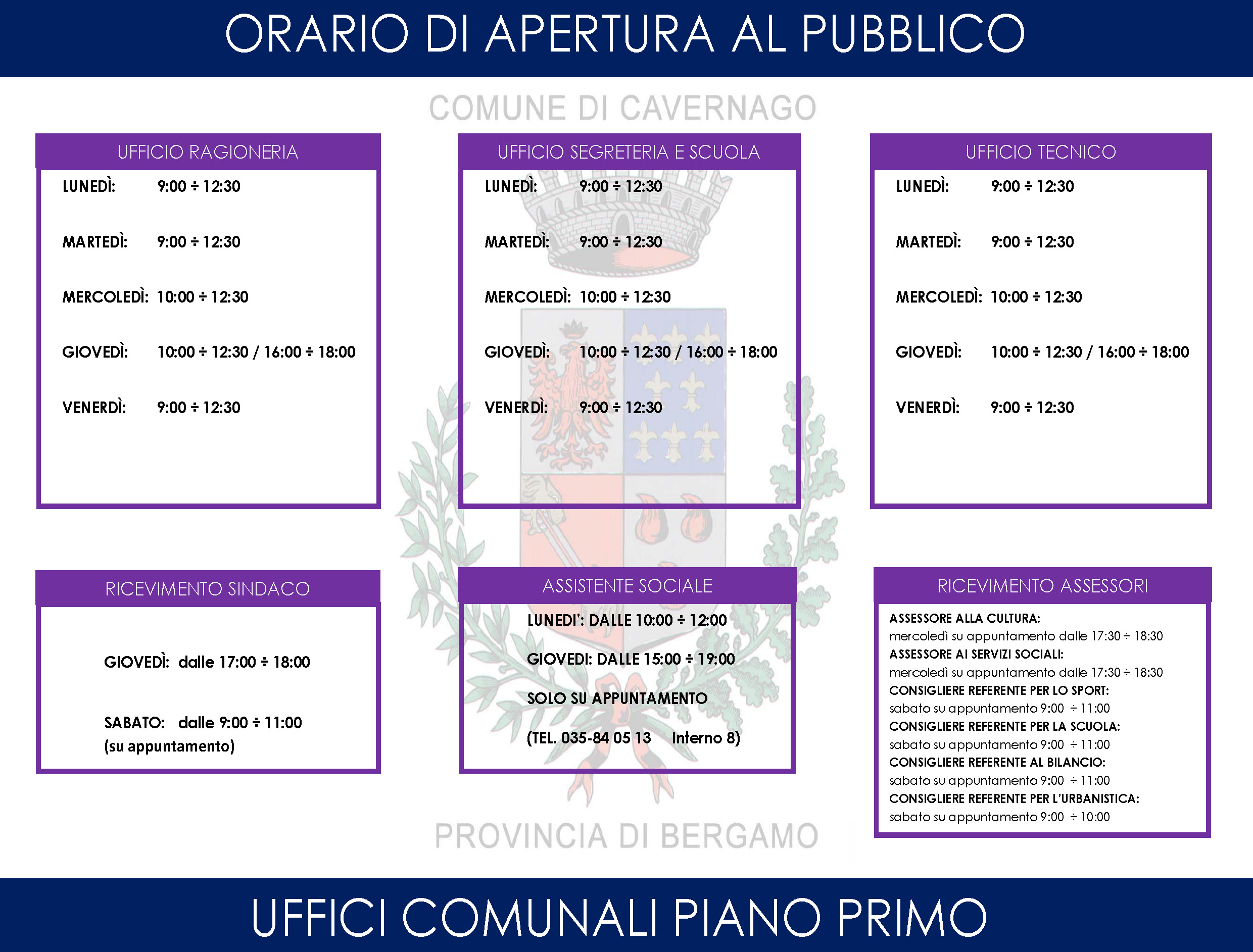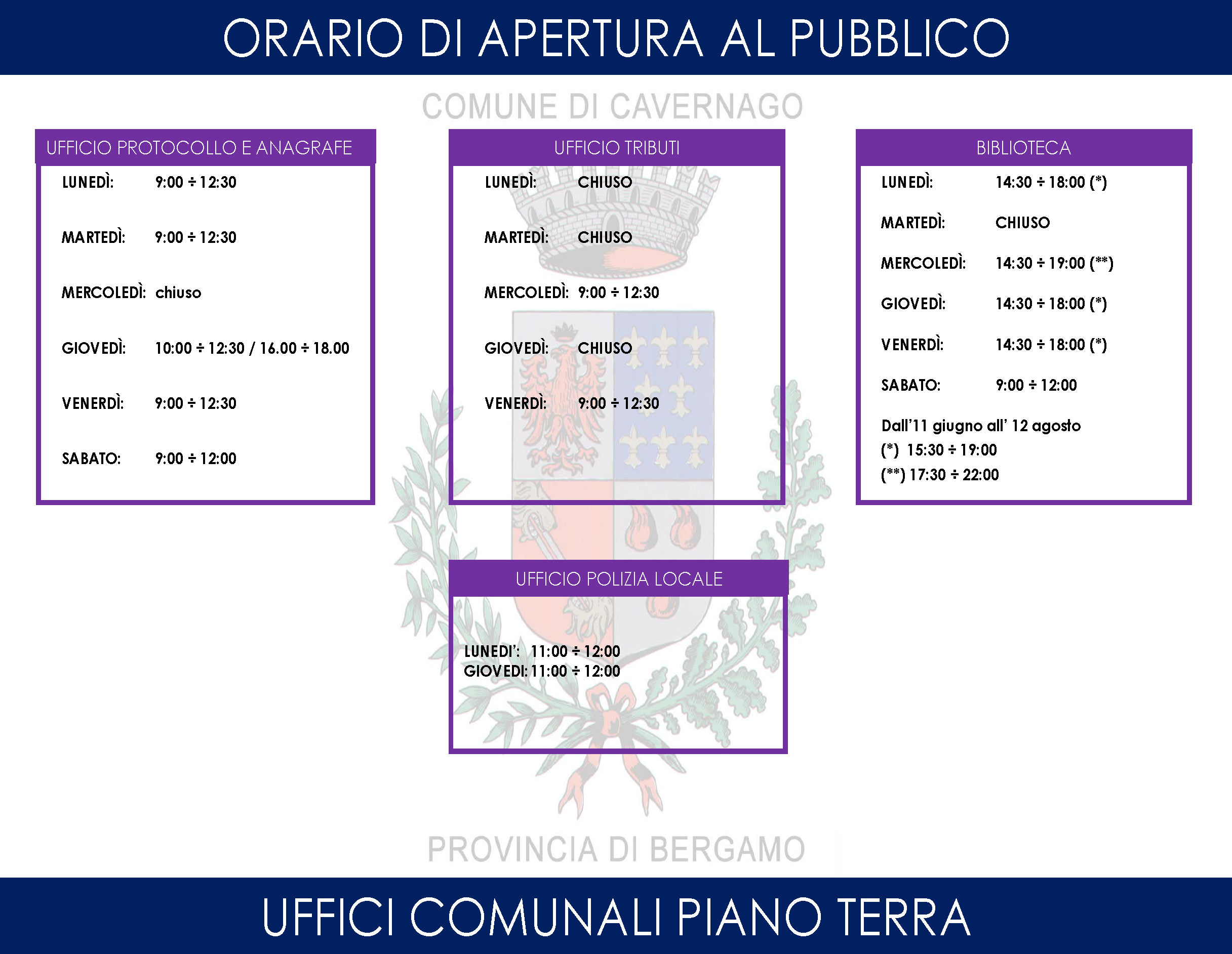 Dal 1 gennaio 2022, gli orari di apertura al pubblico di alcuni uffici comunali subiranno delle lievi variazioni. Alleghiamo alla presente i nuovi orari Previous Next