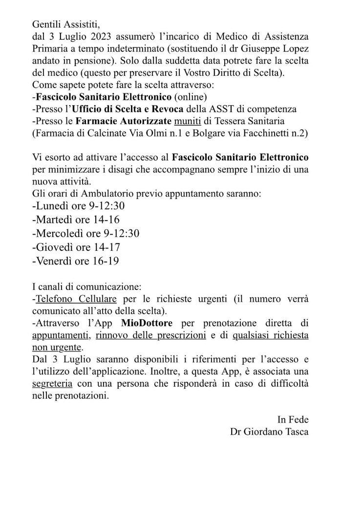 A partire dal 03 Luglio sarà in servizio un nuovo medico definitivo di medicina generale