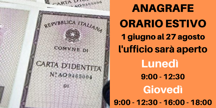 Si comunica che con decorrenza 1 GIUGNO fino al 27 AGOSTO 2022, l'ufficio anagrafe sarà aperto nei seguenti giorni e orari: