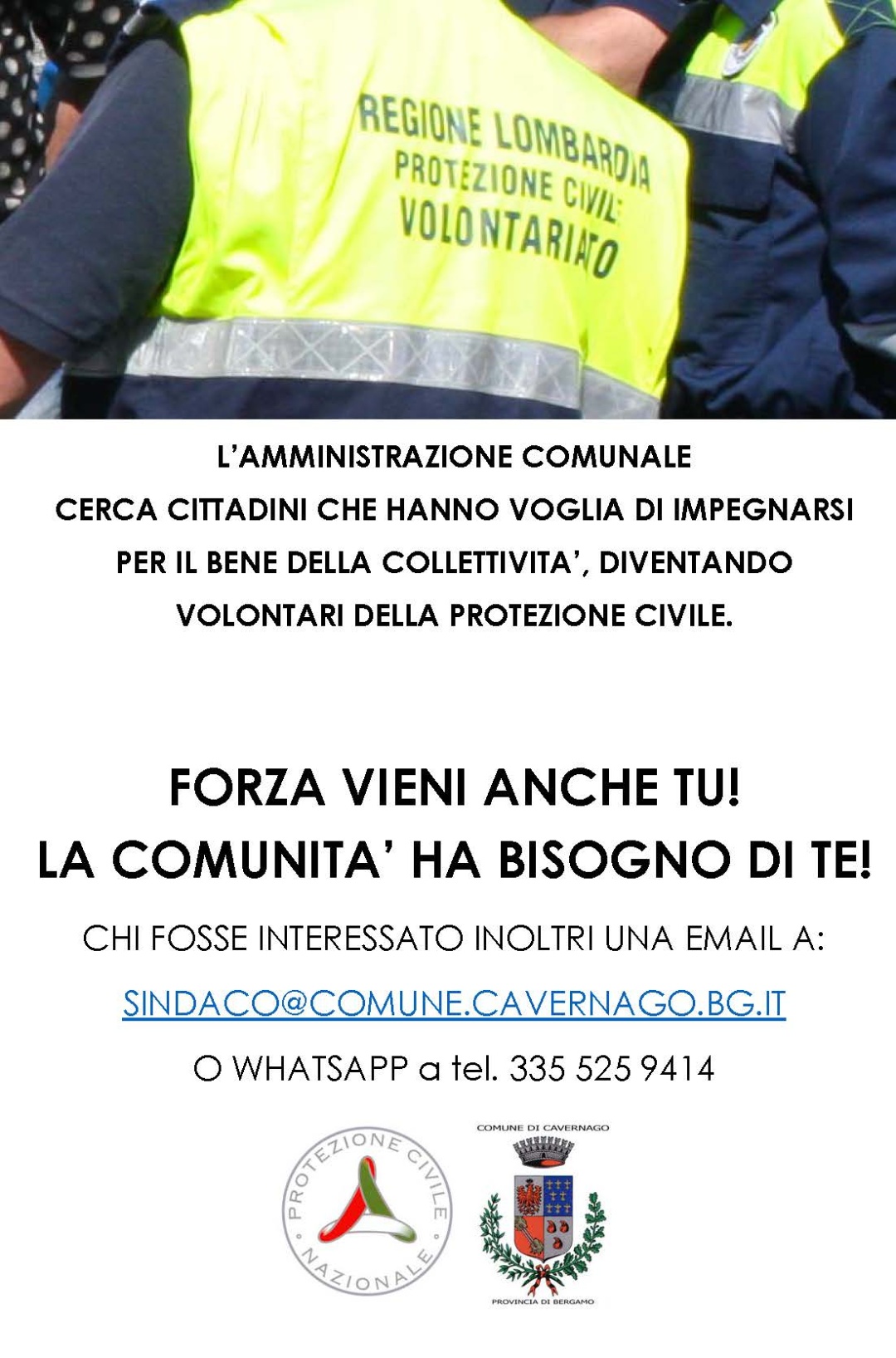 L'amministrazione comunale, è alla ricerca di Cittadini che possano prestare il proprio tempo libero per il bene della Comunità e far parte della PROTEZIONE CIVILE di Cavernago.