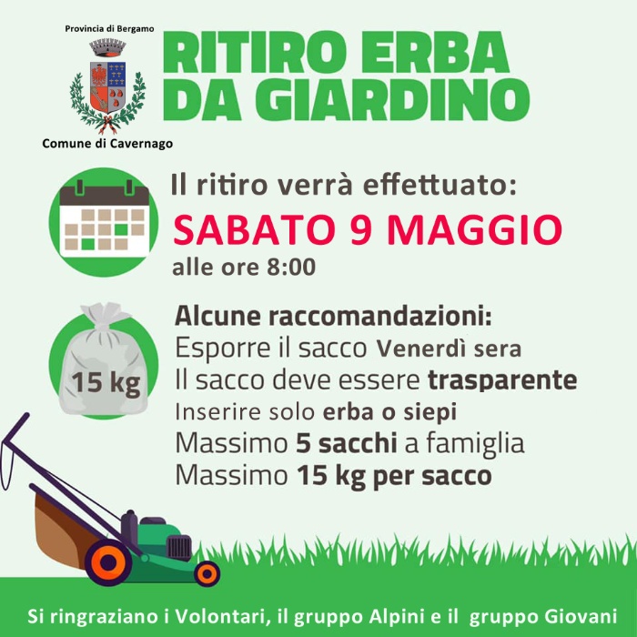 Sabato 9 maggio alle ore 8:00, si ripete l'operazione ritiro sfalcio da giardino grazie ai numerosi volontari al gruppo Alpini e Giovani di Cavernago e Malpaga.