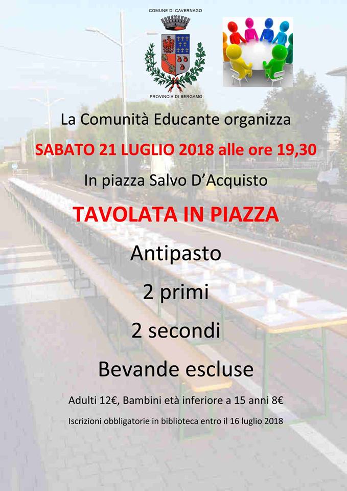 Causa condizioni meteo incerte, la TAVOLATA in piazza si svolgerà presso la palestra comunale di via Giuseppe VERDI.