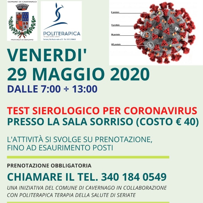 A grande richiesta e grazie alla collaborazione con Politerapica sarà possibile eseguire il test sierologico presso la sala Sorriso venerdì 29 maggio dalle 07.00 alle 13.00 previa prenotazione(attenzione posti limitati)