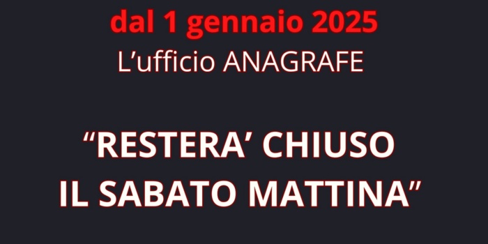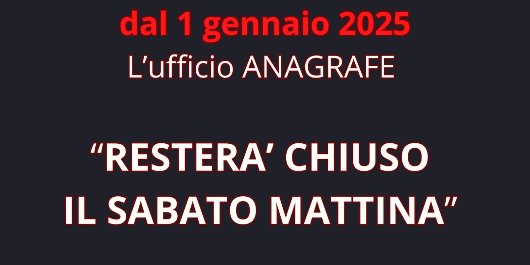 Si comunica che dal 1 gennaio 2025, l'ufficio demografici (anagrafe) resterà chiuso il sabato mattino.