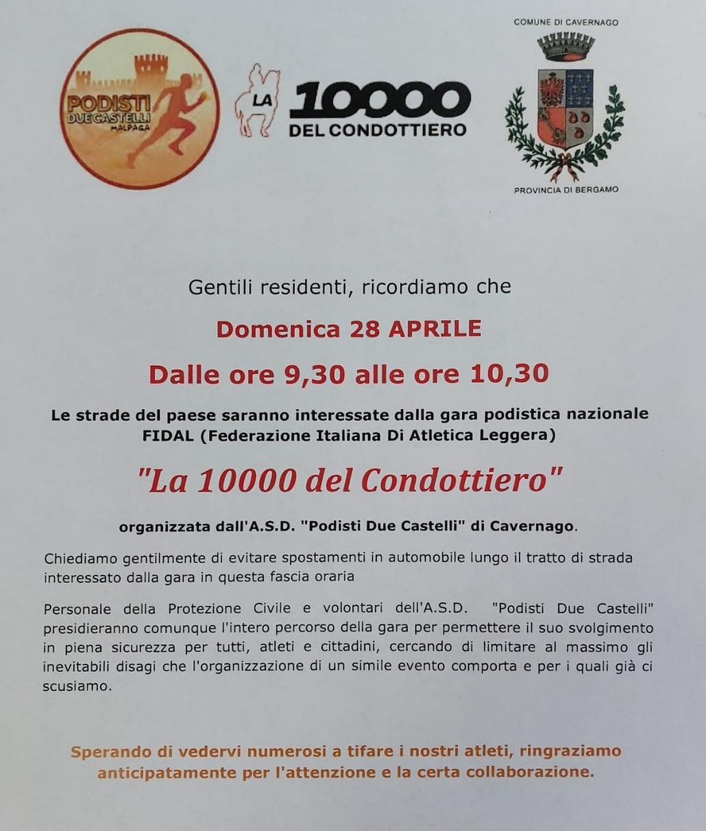 Domenica 28 APRILE dalle 9:30 alle ore 11:00 ci potranno essere disagi alla circolazione causa gare podistica competitiva.