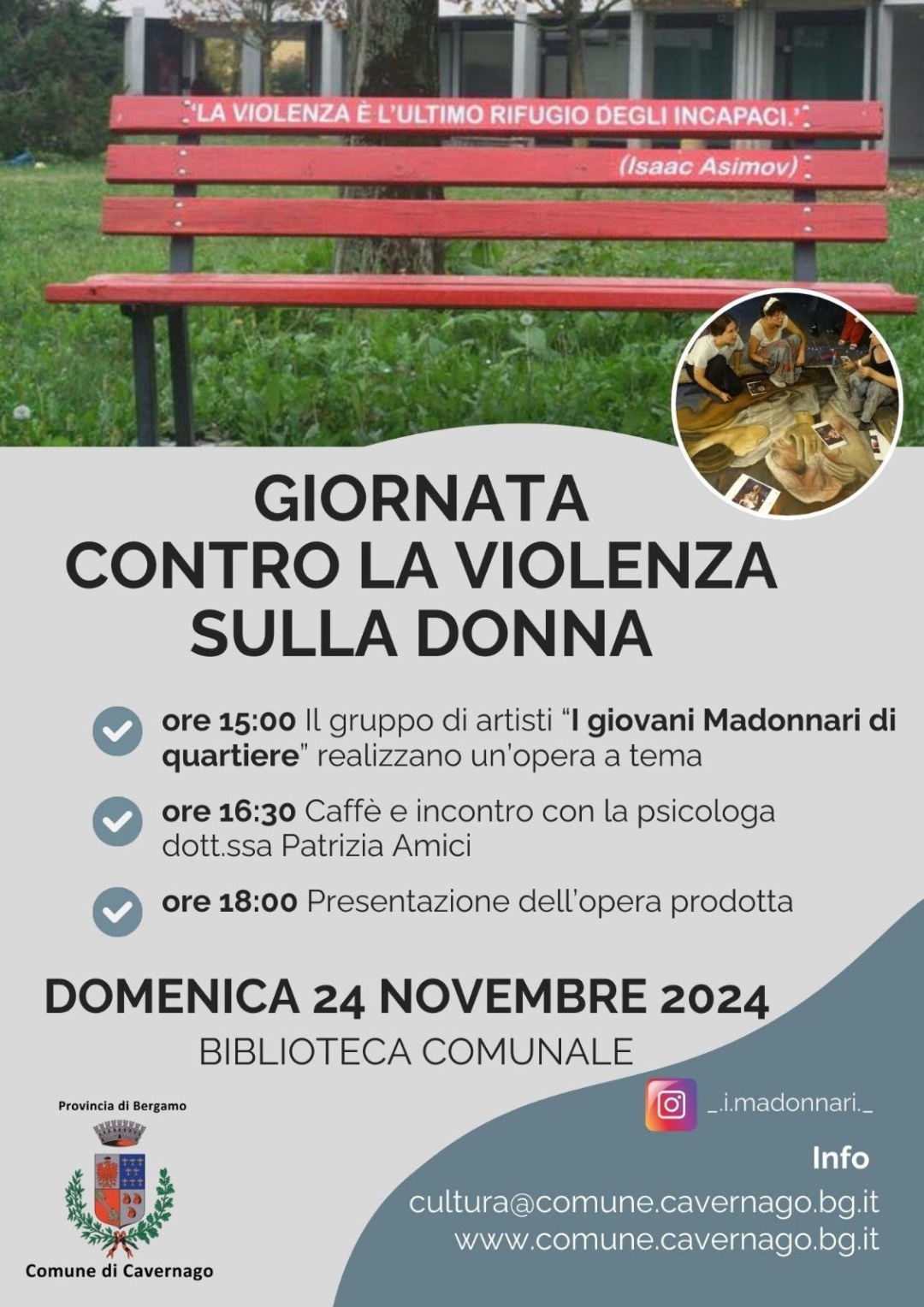 Descrizione Presso la biblioteca GIORNATA CONTRO LA VIOLENZA SULLA DONNA. Per i dettagli vedi la locandina.