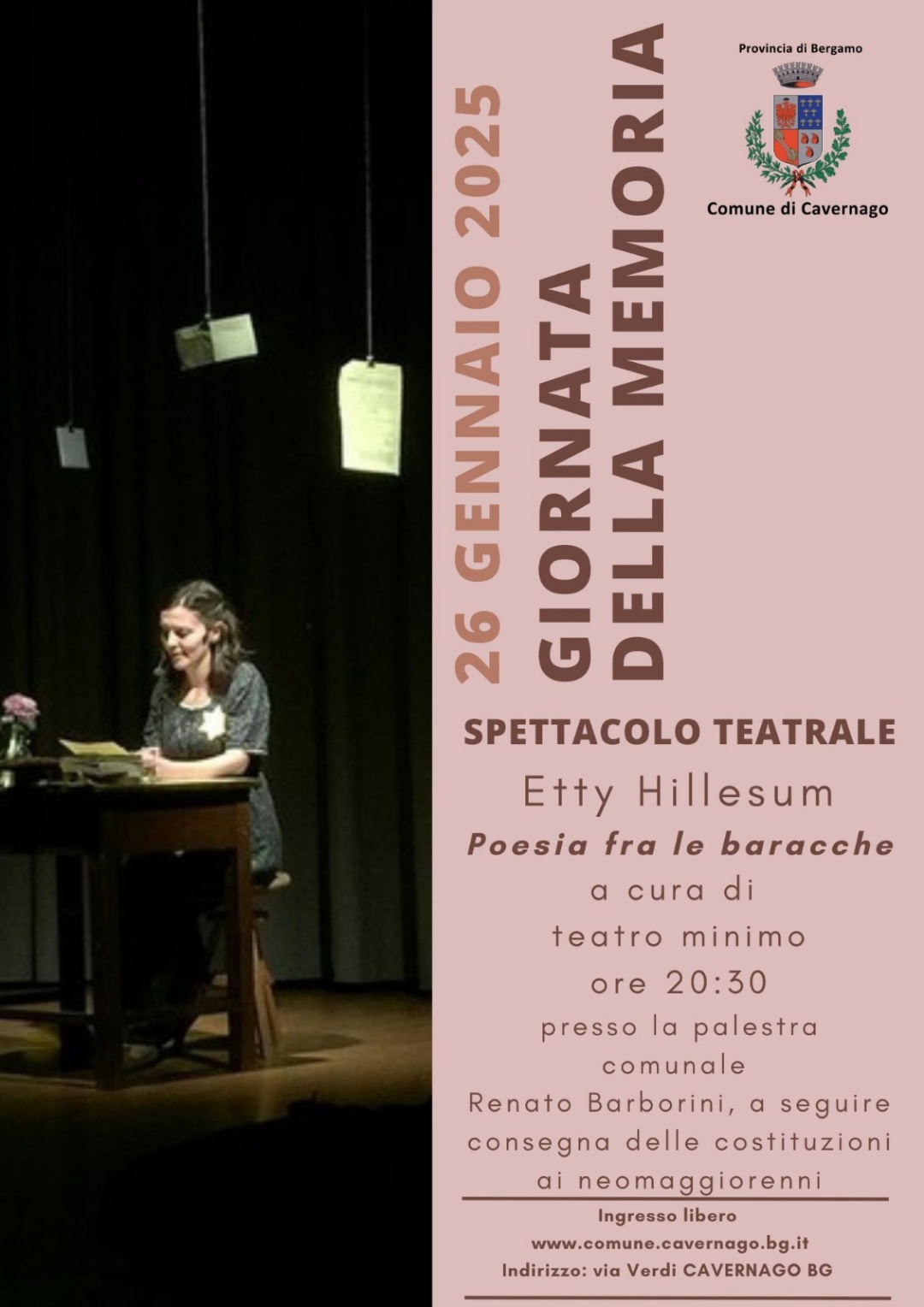 Domenica 26 gennaio in occasione della giornata della memoria presso la Palestra Renato Barborini andrà in scena lo spettacolo ‘Etty Hillesum Poesia fra le baracche’ al termine consegneremo la costituzione ai neo-maggiorenni!