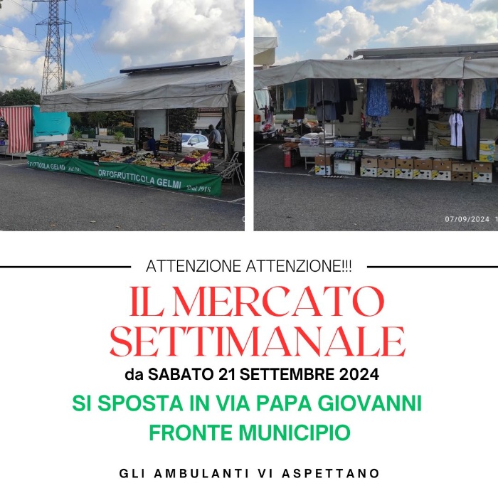 Da SABATO 21 SETTEMBRE 2024, il mercato settimanale si sposta in via PAPA GIOVANNI fronte municipio.