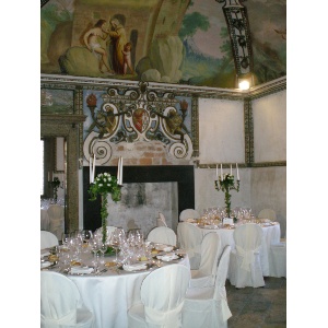 Al piano nobile troviamo raffinati affreschi quattrocenteschi eseguiti da maestranze gotiche francesi e dipinti inquecenteschi di Lattanzio Gambara, Bonifacio Bembo, Giambattista Castello. Notevoli le scene mitologiche seicentesche del lucchese Pietro Ricchi.