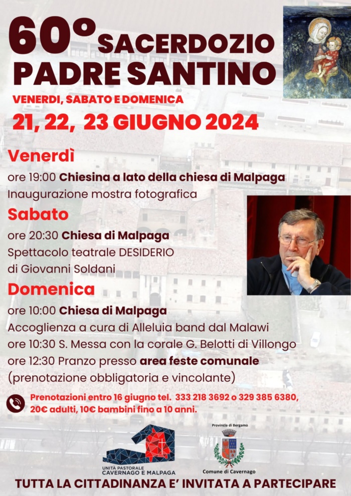 E' con piacere che invitiamo tutti i Cittadini a stringersi intorno a Padre Santino Epis per l'importante traguardo raggiunto. Per l'occasione di saranno 3 giorni di festeggiamenti. La Cittadinanza è invitata a partecipare.