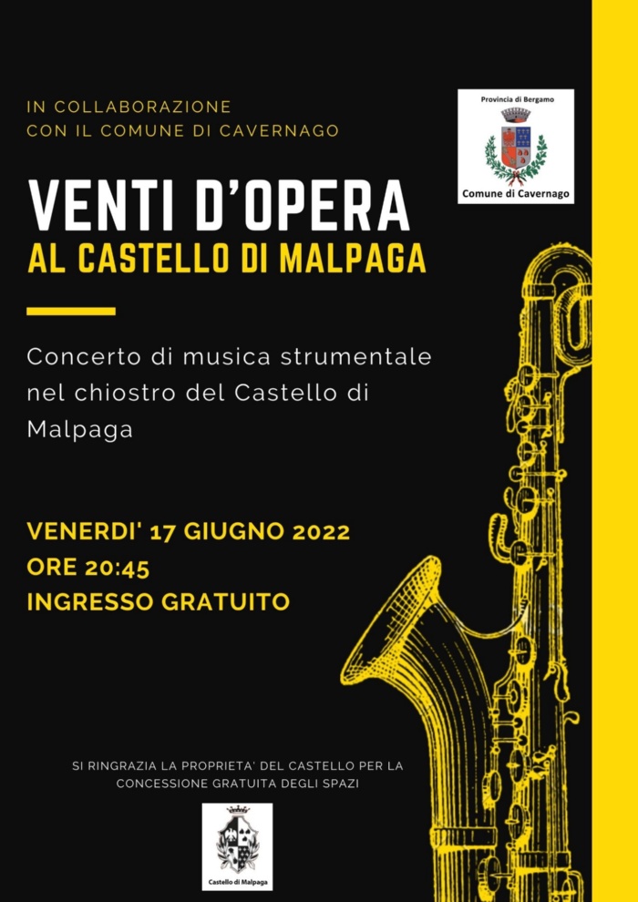 Venerdì 17 giugno 2022 alle ore 20:45 nei giardini degli scudi del Castello di Malpaga, si terrò un concerto strumentale. Ingresso gratuito.