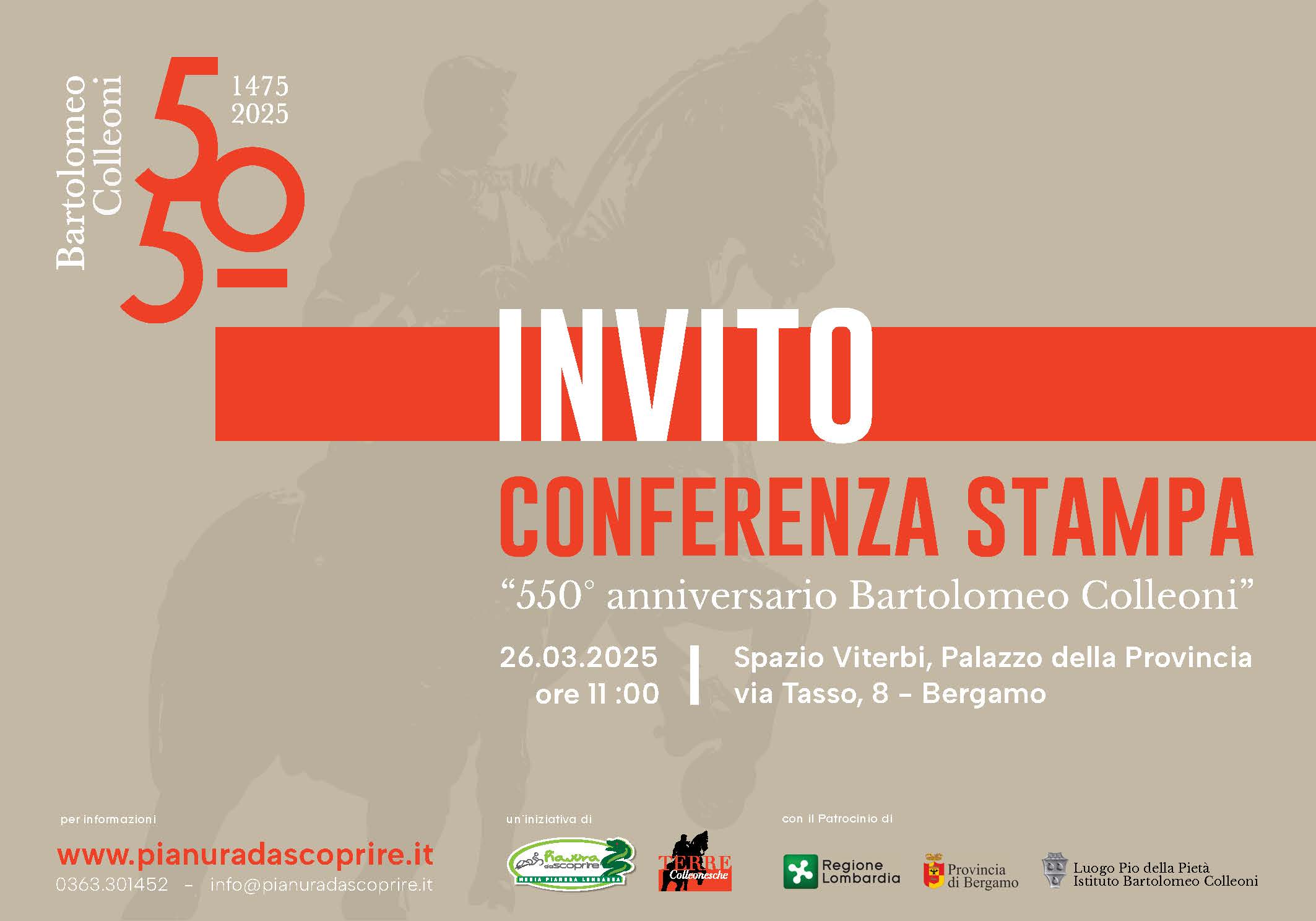 Mercoledì 26 marzo alle ore 11:00, presso la Sala Viterbi della Provincia di Bergamo, si terrà la conferenza stampa di presentazione delle iniziative organizzate in occasione del 550° anniversario della morte di Bartolomeo Colleoni. L’evento vedrà la partecipazione di numerosi enti pubblici e associazioni, impegnati nella valorizzazione della figura e dell’eredità storica del celebre condottiero.
