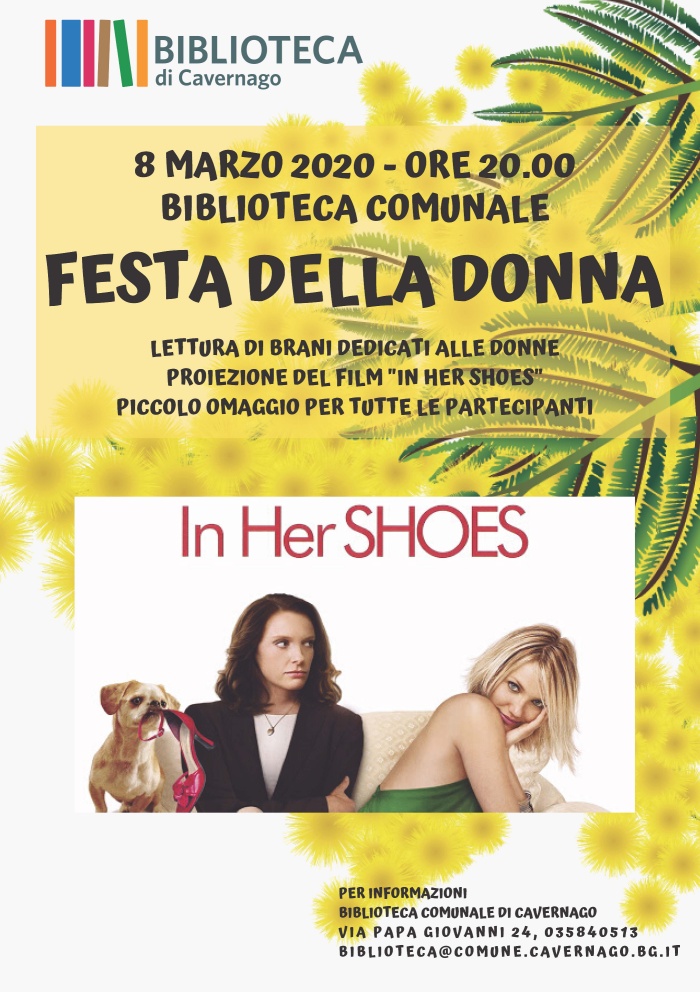 DOMENICA 8 MARZO 2020, alle ore 20,00 presso la biblioteca Comunale, proiezione del film IN HER SHOES. Tutte le Donne sono invitate.