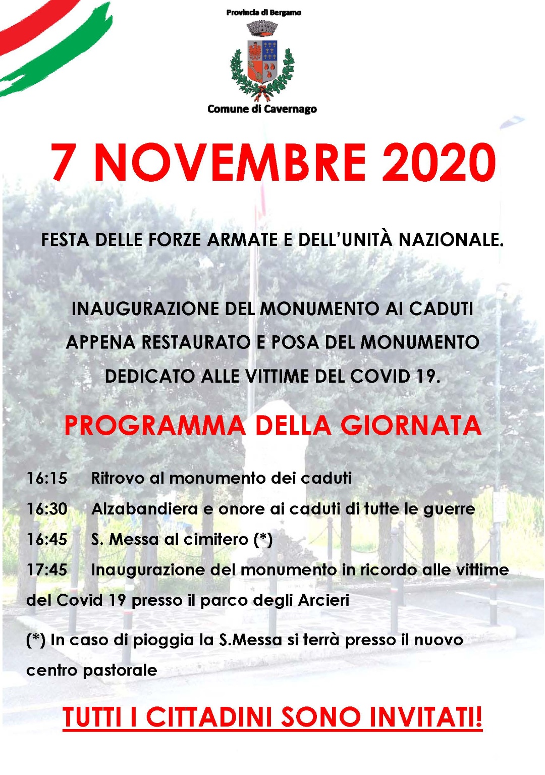 Momento particolare quest'anno dove sarà inaugurato il monumento dei caduti appena restaurato e il nuovo monumento in ricordo dei deceduti causa COVID-19.