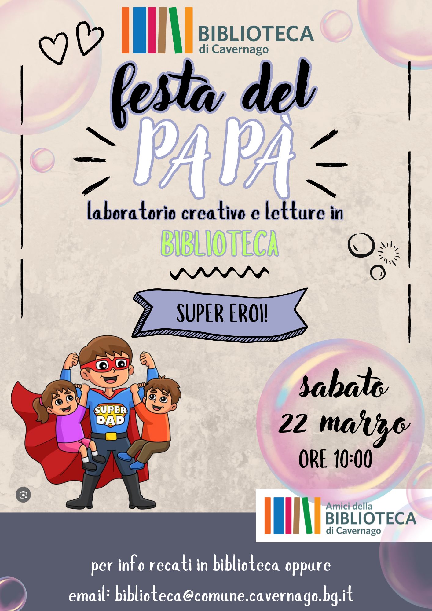 Tutti i Papà sono invitati alla loro festa con i rispettivi bambini. L'appuntamento è per sabato 22 marzo 2025 alle ore 10:00 in Biblioteca.