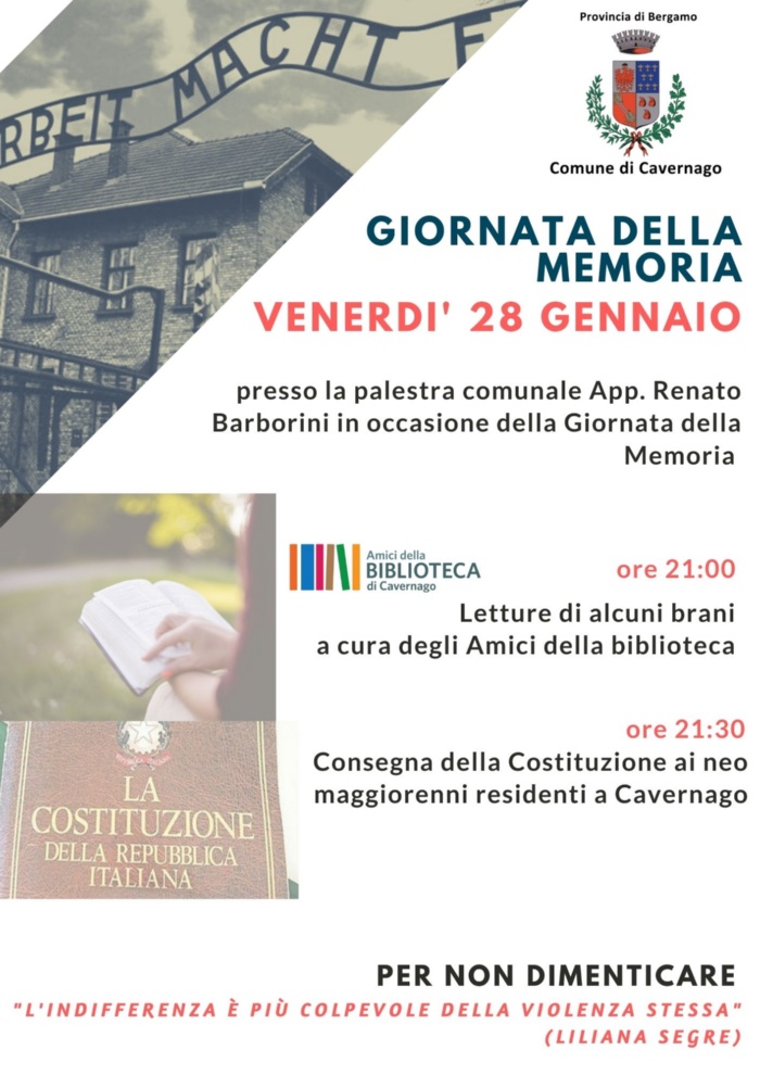 Venerdì 28 gennaio 2022, ci incontriamo presso la palestra RENATO BARBORINI per consegnare la Costituzione italiana ai neo maggiorenni di Cavernago. Sarà l'occasione per ascoltare alcune letture sulla SHOAH a cura degli Amici della Biblioteca.