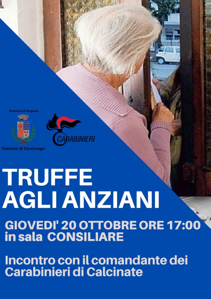 GIOVEDI' 20 OTTOBRE alle ore 17:00 presso la sala consiliare del municipio, si terrà un incontro con il comandante della caserma di Calcinate dal titolo "TRUFFE AGLI ANZIANI", come difendersi da male intenzionati.