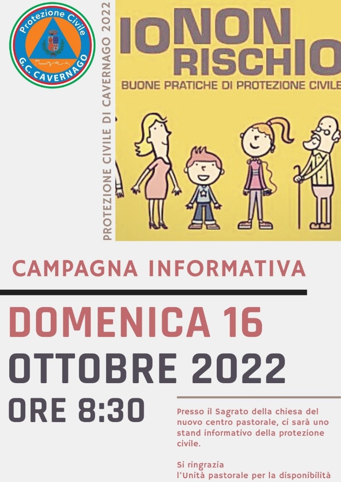 DOMENICA 16 OTTOBRE 2022 dalle ore 8:30 alle ore 12:00 sul sagrato della chiesa del nuovo centro pastorale, sarà attivo il gazebo informativo della Protezione civile "IO NON RISCHIO".