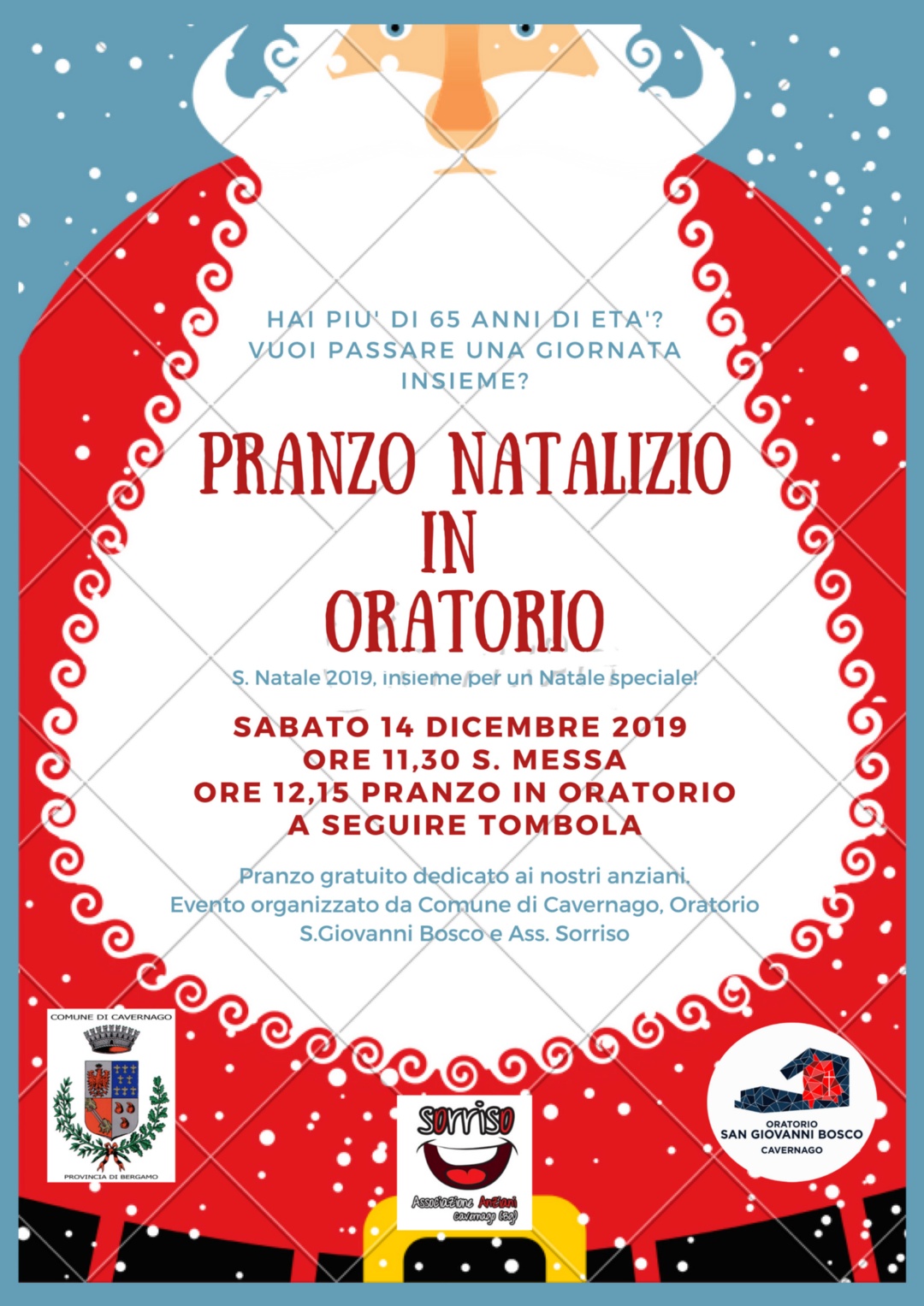 E' tempo di Natale, è tempo di passare una giornata in compagnia. Pranzo gratuito rivolto a tutti gli anziani di Cavernago. In collaborazione con l'oratorio San Giovanni Bosco.