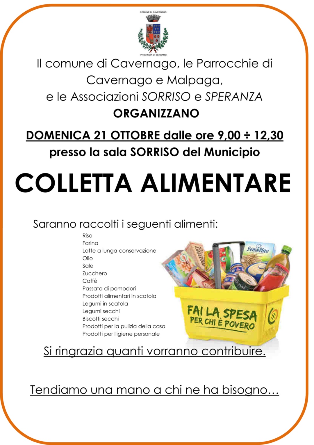Per questo Comune, Parrocchia Cavernago-Malpaga, l'associazione Sorriso e Speranza, organizzano per DOMENICA 21 ottobre 2018 la RACCOLTA ALIMENTARE.